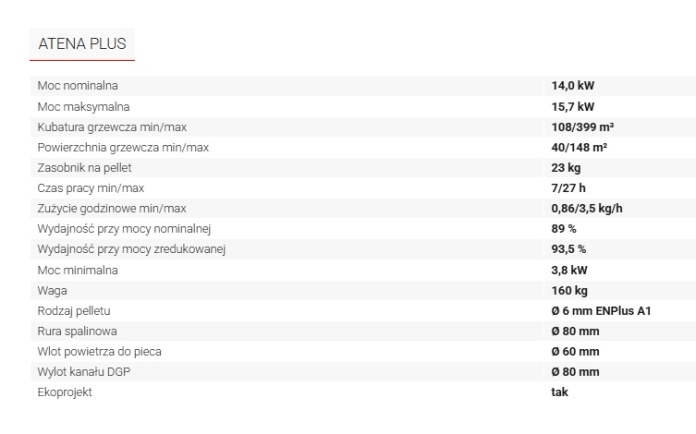 Model Atena Plus o mocy aż 14,0 kW stworzony został do ogrzewania dużej powierzchni. Dzięki trzem niezależnie sterowanym wentylatorom nadmuchowym może ogrzać kilka pomieszczeń (do 5). Pierwszy wentylator nadmuchuje powietrze na pomieszczenie w którym stoi piecyk. Drugi i trzeci ogrzewa kolejne pomieszczenie za pomocą rur rozprowadzających ciepło, które można dodatkowo rozdzielać (nie w zestawie). Wyposażony jest w tygodniowy programator. Jego niewielkie rozmiary i prosta konstrukcja, w połączeniu z najwyższą wydajność czynić go bardzo praktycznym. Umiarkowane zużycie pelletu zapewnia ciągłą pracę urządzenia od 7 do 27 godzin. Oznacza to, że zawsze będzie w stanie dostarczyć odpowiednią temperaturę w pomieszczeniach, przez długi czas. Jest niezwykle łatwy w użyciu, wystarczy kilka intuicyjnych czynności, aby go włączyć i ustawić.