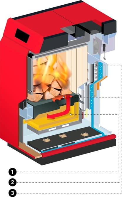 - Ten element wskazuje na palnik, a dokładniej strefę zgazowania i pierwotnego spalania. To tutaj, pod wpływem wysokiej temperatury i kontrolowanego dopływu powietrza, drewno ulega procesowi zgazowania, a powstały gaz drzewny jest spalany. Palnik w kotłach Stadler TR jest wykonany z żeliwa, betonu i szamotui posiada żeliwną dyszę. Jest to też miejsce, które można obserwować przez wizjer.