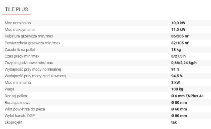 Model Tile Plus o mocy aż 10,0 kW stworzony został do ogrzewania średniej wielkości powierzchni. Dzięki płaskiej konstrukcji, Tile odróżnia się wyglądem od klasycznych piecyków na pellet i kreuje ultra nowoczesnym styl ogrzewania na pellet. Prawdziwie nowoczesna forma. Dzięki dwóm wentylatorom nadmuchowym może ogrzać kilka pomieszczeń (do 3). Pierwszy wentylator nadmuchuje powietrze na pomieszczenie w którym stoi piecyk. Drugi ogrzewa kolejne pomieszczenie lub dwa za pomocą rur rozprowadzających ciepło (nie w zestawie). Wyposażony jest w tygodniowy programator. Jego niewielkie rozmiary i prosta konstrukcja, w połączeniu z najwyższą wydajność czynić go bardzo praktycznym. Umiarkowane zużycie pelletu zapewnia ciągłą pracę urządzenia od 8,5 do 30 godzin. Oznacza to, że zawsze będzie w stanie dostarczyć odpowiednią temperaturę w pomieszczeniach, przez długi czas. Jest niezwykle łatwy w użyciu, wystarczy kilka intuicyjnych czynności, aby go włączyć i ustawić.