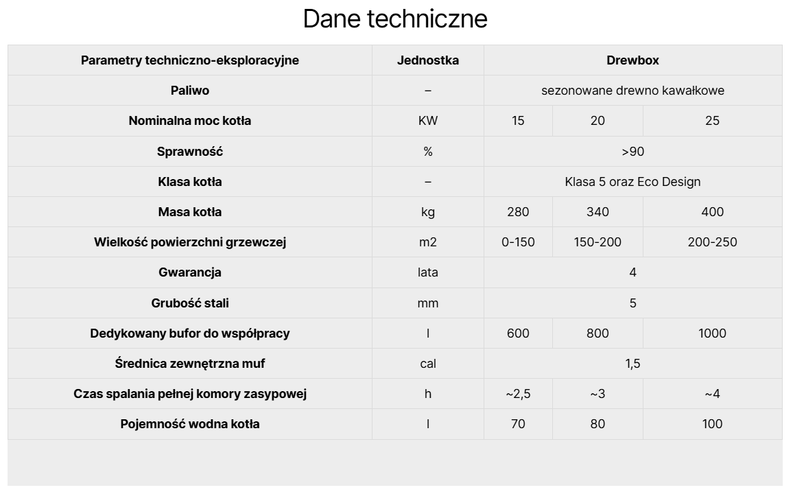 Kocioł Drewbox dostępny jest w wariantach 15, 20 i 25 kW, co pozwala dobrać model do wielkości budynku i zapotrzebowania na ciepło. Według danych producenta urządzenie osiąga sprawność powyżej 90%, spełnia wymagania Klasy 5 oraz EcoDesign, a także posiada certyfikację wymaganą do ubiegania się o dofinansowanie z programu Czyste Powietrze.