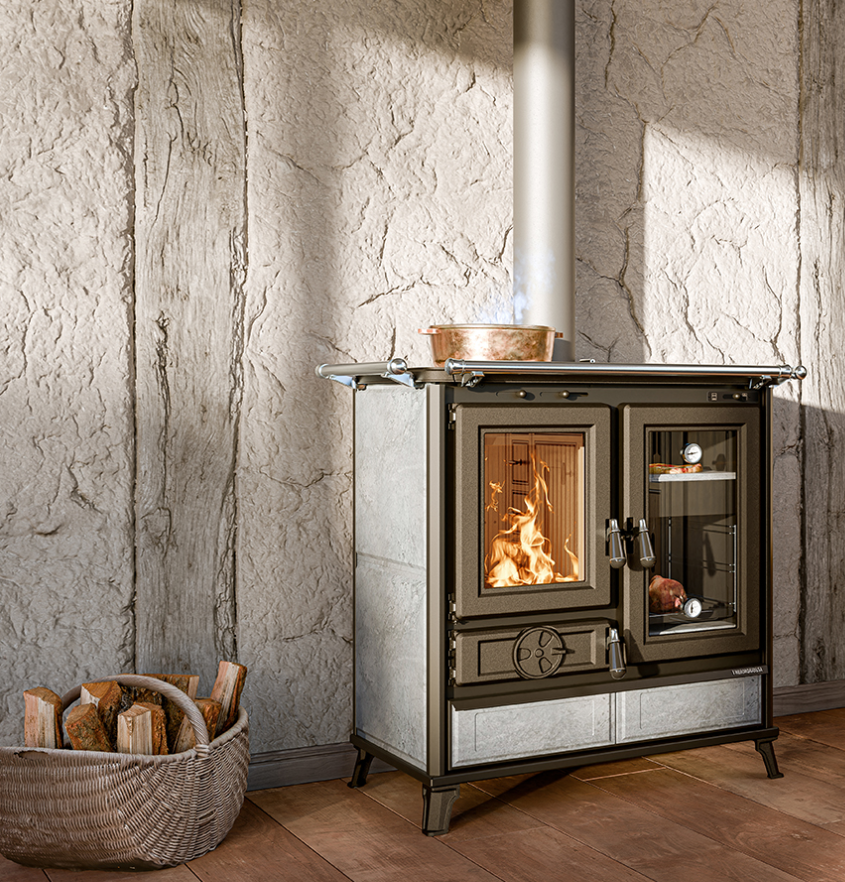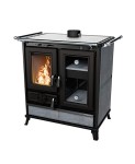 Płyta grzewcza w kuchni Thermorossi MELISSA EVO STONE wykonana jest z żeliwa szlifowanego z dwoma zestawami żeliwnych fajerek. Dwa niezależne piekarniki z płytami ze steatytu i termometrami. Dolny piekarnik wyposażony w tackę ociekową. W dolnej części kuchni wysuwana szuflada na drewno.