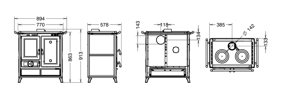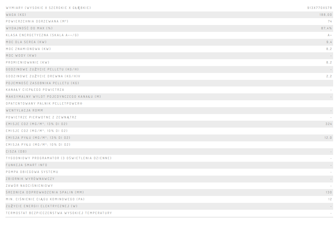 Odprowadzenie spalin możemy wykonać od góry lub z tyłu rurą spalinową o średnicy 130 mm. Regulacja spalania na drzwiach popielnika. Na płycie górnej umieszczony rozrusznik ułatwiający rozpalanie.